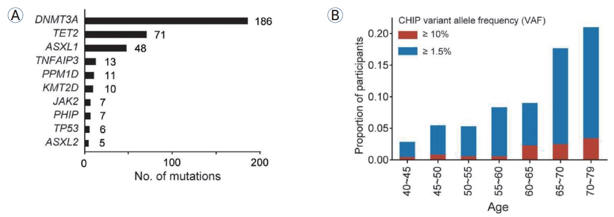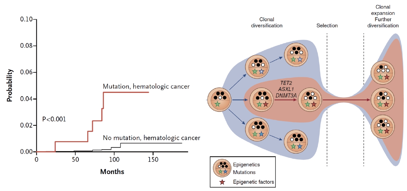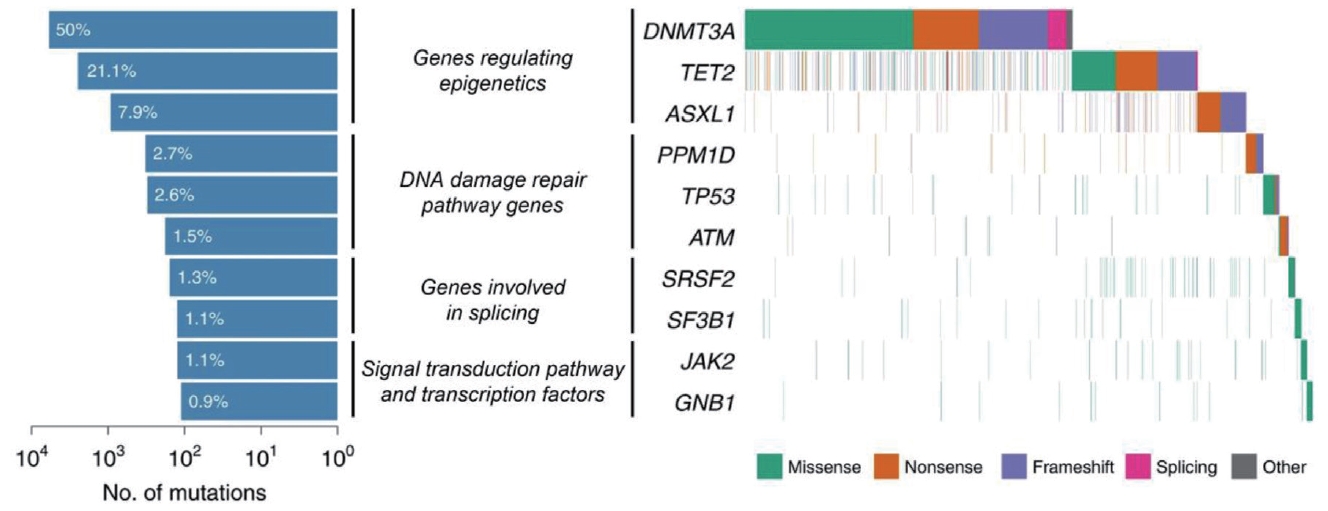 이러한 클론성 조혈증은 주로 후성 유전체 조절을 하는 유전자에 돌연변이가 발생하는데 대표적인 유전자는 DNMT3A, TET2, ASXL1 등이 있다. 그 외에도 스플라이싱(splicing)을 조절하는 SF3B1, U2AF1, SRSF2 등의 유전자에도 돌연변이가 일어날 수 있고 DNA damage repair (DDR)에 영향을 주는 TP53, PPM1D와 같은 유전자에도 돌연변이가 일어날 수 있다(Fig. 2).