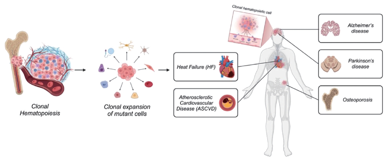 앞서 클론성 조혈증에 의해서 인간의 면역 체계가 대식세포를 중심으로 변동한다고 기술하였다. 돌연변이가 발생하는 유전자에 따라서 면역이 변동되는 내역은 다를 것으로 추정되는 데 TET2, DNMT3A에 대해서는 비교적 많은 연구가 이루어져 있다. TET2에 대해서는 특히 많은 연구가 이루어졌는데 TET2 유전자에 돌연변이가 조혈모세포에 발생하면 골수에서 골수구의 증식이 더 활발하게 일어나 골수구성 세포에 치우친 분화가 일어나며 이러한 골수구성 세포들은 염증성 사이토카인을 과도하게 분비하는 것으로 밝혀졌다[5,6]. 특히 마크로파지에서 NOD-like receptor family pyrin domain-containing protein 3 (NLRP3) 인플라마좀이 발달하면서 interleukin (IL)-1b가 과발현되는 특징을 가지고 있다. 이러한 면역 변동으로 인하여 다양한 만성 질환에 클론성 조혈증이 영향을 미치는 것이 속속 밝혀졌는데(Fig. 4) 대표적인 것들을 정리해 보면 다음과 같다.