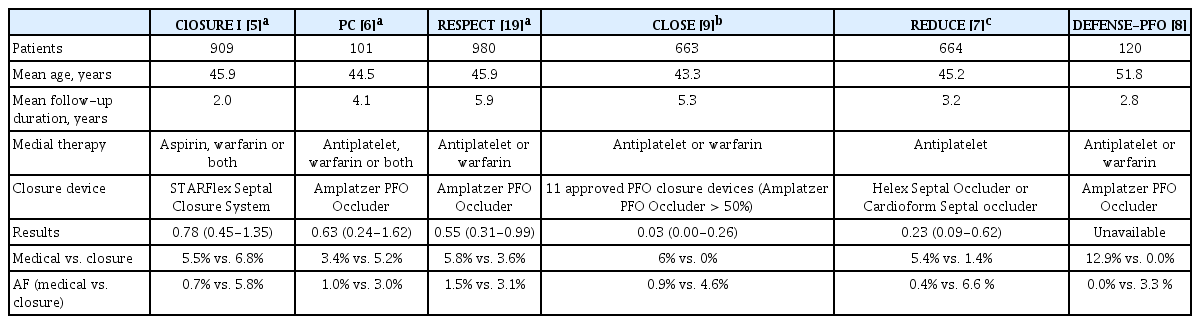 초기 무작위 연구인 CLOSURE I과 PC 연구에서는 난원공 폐쇄술이 약물 치료보다 더 나은 결과를 보이지 못하였다[5,6]. 이러한 결과는 난원공 개존증이 뇌경색 발생과 직접적인 연관성이 높은 환자를 적절히 선별하지 못한 점, 혈전 형성 위험이 있는 기구 사용, 높은 시술 실패율, 통계적 검정력 부족 등이 문제점으로 분석되었다. 이후 연구들은 이러한 초기 연구의 한계를 보완하며 진행되었다. RESPECT 연구에서는 초기에는 중립적인 결과를 보였으나 장기 추적 관찰에서는 난원공 폐쇄술이 재발성 뇌경색 위험을 유의미하게 줄이는 것으로 나타났다[19]. REDUCE 연구에서는 난원공 폐쇄술이 항혈소판 치료 단독 요법보다 뇌경색 발생률을 효과적으로 감소시켰고[7] DEFENSE-PFO 연구에서는 난원공 폐쇄술이 약물 치료와 비교하여 뇌경색, 혈관 사망, 주요 출혈로 구성된 복합 결과의 발생률을 2년간 유의미하게 낮추는 결과를 보였다[8]. CLOSE 연구에서는 난원공 폐쇄술을 받은 환자들에서 허혈성 뇌경색이 한 건도 발생하지 않았다(Table 2) [9].