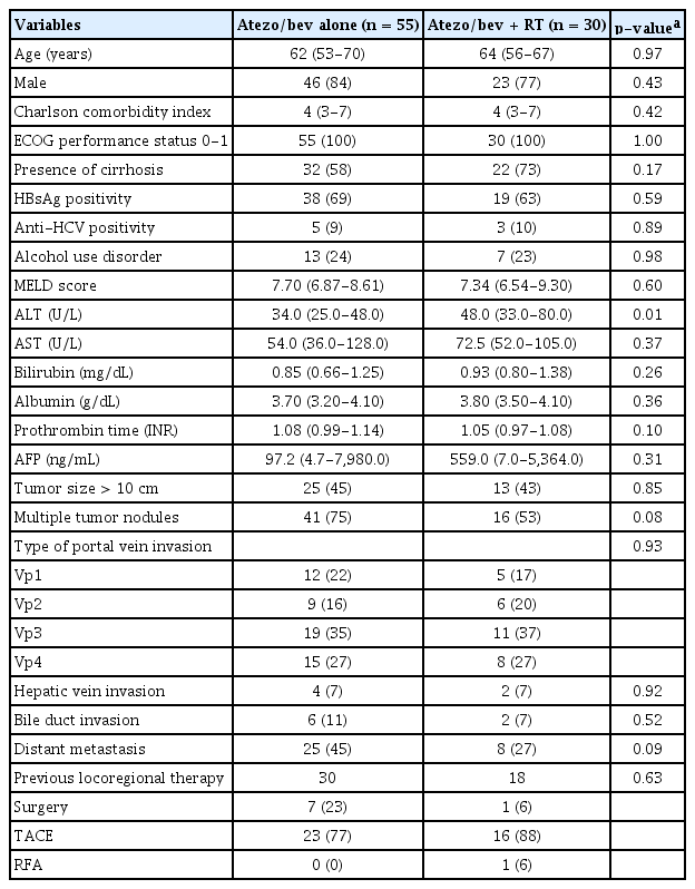 The baseline characteristics of the study population are summarized in Table 1. The cohort had a mean age of 62 years (SD, 10 years), and 69 patients (81%) were male. The clinical and laboratory parameters were comparable between the two groups, except for serum alanine aminotransferase (ALT) levels, which were significantly higher in the atezo/bev plus RT group than in the atezo/Bev group (p= 0.01).