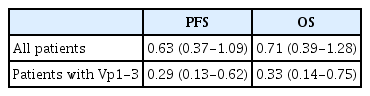 We conducted subgroup analyses of PFS, OS, and DCR in 62 patients without Vp4 involvement, because Vp4 invasion is associated with extremely poor prognosis and rapid disease progression. Among these patients, the overall DCR was 31% (19 of 62): 30% (12 of 40) in the atezo/bev-only group and 32% (7 of 22) in the group that received systemic therapy plus RT. Multivariate Cox regression analysis revealed that the addition of RT was significantly associated with an improved PFS (aHR = 0.29, p= 0.002) and OS (aHR = 0.33, p= 0.01) (Table 2; Supplementary Tables 4, 5; Supplementary Figs. 2, 3).