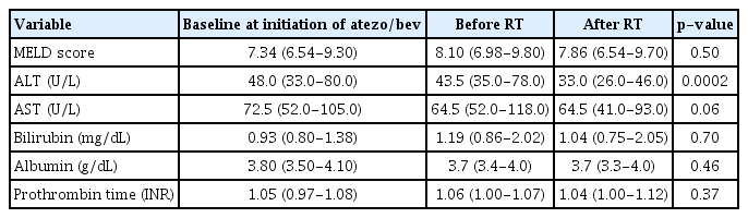 No major signs, symptoms, or deterioration in the ECOG PS were observed, which could be attributed to RT during or after the treatment period. Follow-up laboratory assessments demonstrated preserved liver function, including stable model for end-stage liver disease scores, and a significant reduction in serum ALT levels (43.5 vs. 33.0, p= 0.0002) after RT (Table 3).