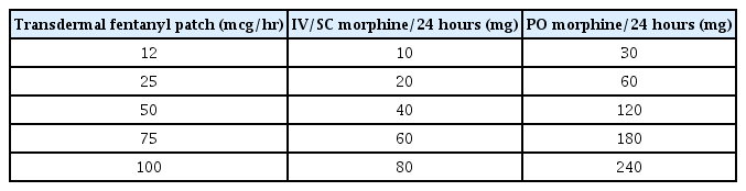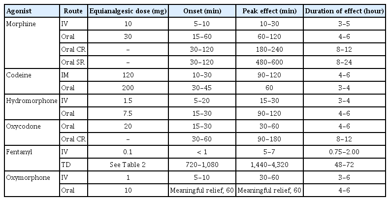 비마약성 진통제와 마찬가지로 마약성 진통제의 투여는 경구 투여가 기본이며 가장 간편하다. 그러나 이는 환자의 전신 상태에 따라 변경될 수 있다. 약제의 시작은 경구용 morphine으로 시작하는 것을 추천하며 저용량으로 시작하여 서서히 용량을 증가해야 한다. 속효성 제제는 서방형 제제에 비해 약물 오남용 및 내성 발생의 가능성이 높기 때문에 돌발성 통증을 조절하는 데 사용하는 것이 좋다[10,11]. 유지 용량에는 서방형 제형을 사용한다. 약물의 적정 용량은 부작용 없이 통증이 조절되는 용량으로 각 환자들마다 통증을 평가하고 개별화하여 약물 용량을 조절하는 것이 중요하다(Table 1, 2).