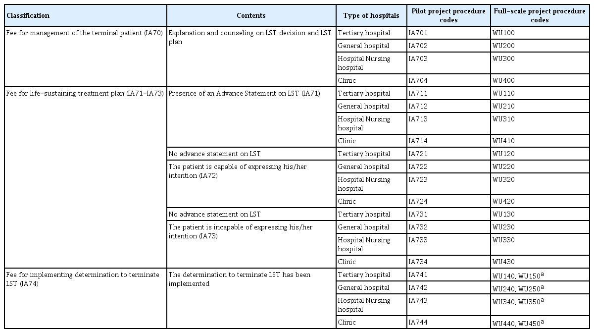 말기 환자 등 관리료(IA70)는 의료기관윤리위원회를 직접 운영하며 연명의료 결정 등과 관련된 제도 안내 및 상담 등을 제공하는 기관에 한하여 산정한다. 연명의료계획료(IA71-IA73)는 임종 단계의 환자 판단, 상담, 환자의 의사 확인 및 서식 작성 등 연명의료 계획을 위한 일련의 과정을 담당 의사가 연명의료결정법에 적합하게 진행하고 서식 등록을 완료한 경우 산정한다. 연명의료계획료는 사전 의사결정이 확인된 경우, 즉 사전연명의료의향서 기작성 환자(IA71)와 사전 의사결정이 확인되지 않은 경우(IA72, IA74)로 나뉜다. 사전 의사결정이 확인되지 않은 경우는 다시 의사 표현이 가능한 환자를 대상으로 한 경우(IA72)와 환자의 의사 표현이 불가능하여 다수의 가족을 대상으로 연명의료 계획을 진행한 경우(IA73)로 나뉜다. 연명의료이행관리료(IA74)는 연명의료 중단 등 결정에 따라 그 결정을 적합하게 이행한 후 서식 등록을 완료한 경우이다. 연명의료 결정 관련 행위별 수가 코드는 연명의료 결정 및 이행이 진행된 의료기관의 종별에 따라 상급종합병원(IAOO1), 종합병원(IAOO2), 병원·요양병원·한방병원(IAOO3), 의원·한의원(IAOO4)으로 구분되어 표기된다(Table 1).
