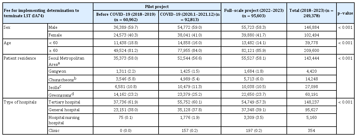 연명의료이행관리료(IA74) 수가 코드를 통해 연구 집단의 구간별(COVID-19 이전, 2018년 2월부터 2019년 12월까지; COVID-19 이후, 2020년 1월부터 2021년 12월까지; 본사업 기간, 2022년 1월부터 2023년 9월까지) 기저 특성을 분석한 결과 세 구간 모두 남성이 여성보다 많았고 60세 이상이 많았다. 지역은 수도권(서울, 경기, 인천)이 많았고 의료기관 종별로는 상급종합병원과 종합병원이 많았다. 이는 선행 연구에서 제시한 수가 시범사업의 운영 현황과 유사한 결과였다[8,9]. 단 의료기관 종별 분율 변화에 주목할 만하다. 시범사업 기간 중 COVID-19 이전 구간에서는 의료기관 종별 분율이 상급종합병원 61.9%, 종합병원 38.0%, 병원·요양병원·한방병원 0.1%였고 COVID-19 이후 구간에서는 상급종합병원 60.1%, 종합병원 37.8%, 병원·요양병원·한방병원 1.9%였던 반면 본사업 전환 이후에는 상급종합병원 57.3%, 종합병원 39.1%, 병원·요양병원·한방병원 3.5%로 상급종합병원의 분율이 감소하고 병원·요양병원·한방병원의 분율이 유의미하게 증가하였다.