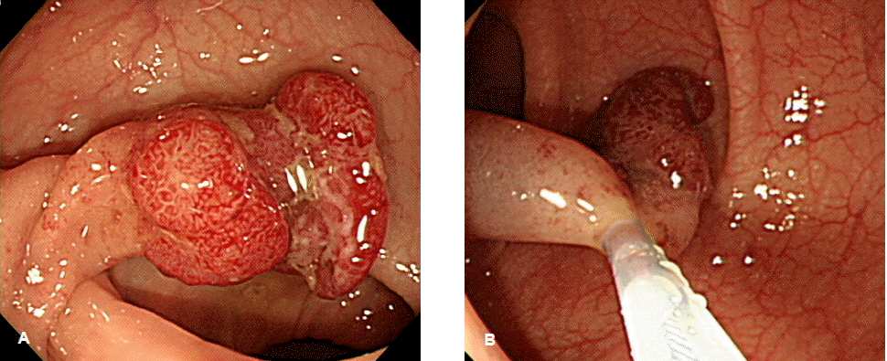 (A) A polyp is seen in the sigmoid colon. Its ulcerated nonstructural mucosal surface suggests cancerous change. (B) The lesion can be resected easily by snaring because of the definite stalk.