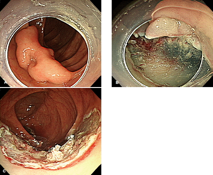 내시경점막하박리술은 점막하 용액 주입 후 절개도를 이용해 점막하층을 박리하여 종양을 절제해 내는 방법이므로 이론적으로는 병변의 크기에 상관 없이 일괄절제가 가능하다. 실제 여러 연구에서도 큰 대장종양에 대한 내시경점막하박리술의 일괄절제율은 80~90% 정도로 높게 보고되고 있다21). 그러나 대장벽은 매우 얇아 내시경점막하박리술을 시행할 경우 5% 전후의 비교적 높은 천공 위험성이 있으며, 점막하박리술을 이용한 일괄절제에 걸리는 시간도 적지 않다는 문제가 있다22-24). 따라서 대장에서의 내시경점막하박리술이 가장 활발히 이루어지고 있는 일본에서는 조기대장암이 의심되면서, 2 cm 이상으로 크고, 올가미를 이용한 전통적인 내시경절제술 기법들로는 일괄절제가 불가능해 보이는 경우에 한해 내시경점막하박리술을 시행하도록 권고하고 있다(그림. 2)25). 최근에는 종양을 박리되는 반대면으로 당겨서 시술을 쉽게 하기 위한 부속기기 개발26,27), sodium hyaluronate 점막하 주입액 도입28), 대장 확장으로 인한 불편감 최소화 위해 CO2 사용29) 등과 같은 새로운 시도들이 지속되면서, 대장 내시경점막하박리술이 과거에 비해 용이해지고 있는 실정이다.