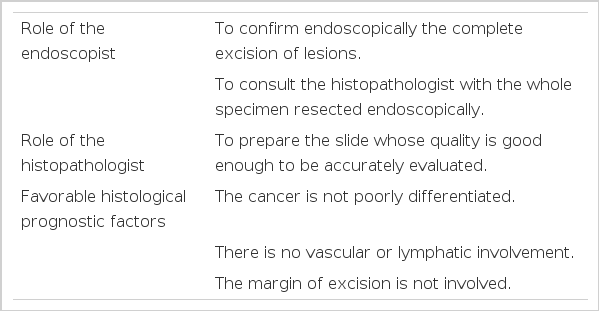 그러므로, 내시경절제술로 절제한 조기대장암 조직을 면밀히 병리 검토하여 표 1 및 표 2의 권고안에서 제시하고 있는 병리학적 예후인자들의 유무를 확인하고 추가 외과수술 필요성을 결정해야 한다.