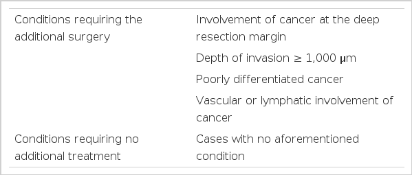 일본 대장암연구회에서도 표 2에서 제시된 네 가지 위험인자가 모두 없을 경우에는 추가적 대장절제술이 필요 없다고 권고하였다20).