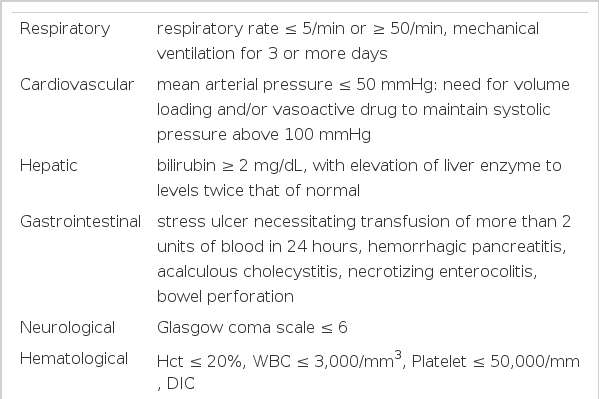 신기능의 회복은 2회 연속 측정한 혈청 크레아티닌 값의 평균이 기저 혈청 크레아티닌 수준으로 감소되었는지 확인하여 판정하였다. 장기부전의 정의는 표 1과 같다7). 대상군을 생존 여부에 따라 나누어 예후인자를 비교 분석하였다. 또한 추적이 가능했던 14명에 대해 2년 후 혈청 크레아티닌을 확인하였다.