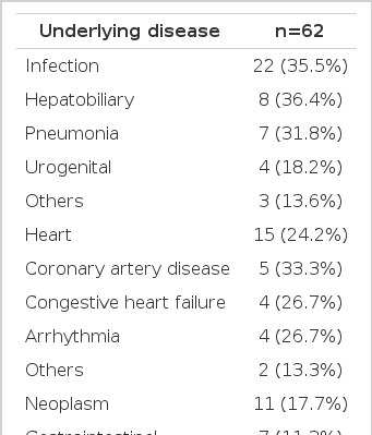 총 62명 중 남자가 33명(53.2%), 여자가 29명(46.8%)이었고, 평균 연령은 82.6±2.2세였다. 기저 질환은 감염성 질환이 22예(35.5%)로 가장 많았으며 담낭염 및 담관염을 포함한 간담도계 감염이 8예(36.4%), 폐렴이 7예(31.8%), 비뇨생식기계 감염이 4예(18.2%)였고, 그 외 쓰쓰가무시병 1예 및 원인이 불명확한 경우가 2예를 차지하였다. 순환기계 질환은 15예(24.2%)로 관상동맥 질환이 5예(33.3%), 울혈성 심부전 및 부정맥이 각각 4예(26.7%)였다. 그 외 종양성 질환 11예(17.7%), 소화기계 질환 7예(11.3%), 간질환 2예(3.2%), 호흡기계 질환, 신경계 질환, 혈관성 질환이 각각 1명(1.6%)이었고, 2명은 기저질환이 없었다(표 2).