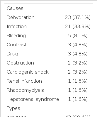 급성 신손상의 원인으로는 탈수가 23예(37.1%)로 가장 많았으며, 감염 21예(33.9%), 출혈 5예(8.1%), 조영제 3예(4.8%), 약물 2예(3.2%), 요로 폐쇄 2예(3.2%), 심인성 쇼크 2예(3.2%)였고, 신경색, 횡문근 융해증, 간신증후군이 각 각 1예(1.6%)였다. 기전에 따라 원인을 분류하였을 때 신전성 신손상이 43예(69.4%)로 가장 많았으며 신성 신손상이 17예(27.4%), 신후성 신손상이 2예(3.2%)였다(표 3).