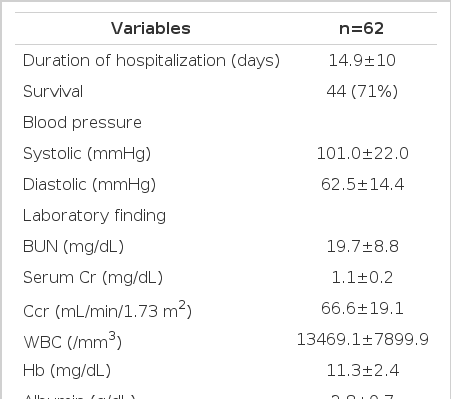 평균 입원 기간은 14.9±10일이었고, 24예(38.7%)에서 중환자실 집중 치료가 필요하였다. 승압제 사용은 19예(30.6%), 인공호흡기 치료는 13예(21%), 투석 치료는 1예(1.6%)였고, 39예(62.9%)에서 신기능이 회복되었다. 28예(45.1%)에서 장기 부전이 동반되었고, 순환기계부전이 21예(75.0%)로 가장 많았으며 이 중 13예에서 패혈증이 확인되었다. 또한 10예(16.1%)에서는 다발성 장기 부전 소견을 보였다(표 4).
