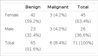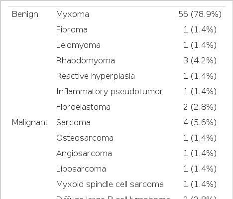 2000년 1월부터 2006년 12월까지 총 7년 동안 71명의 환자가 발견되었으며, 이 중 남자는 26명, 여자는 45명으로 여자가 월등히 많았고, 진단 당시 환자들의 평균 연령은 57.67±14.06으로 범위는 24세부터 86세 사이에 있었다. 71명의 원발성 심장 종양 환자 중에 65명(91.5%)은 양성 종양이었던 반면 6명(8.5%)만 악성 종양으로 진단되었다(표 1). 65명의 양성 종양 중에 점액종 56명(78.9%), 횡문근종 3명(4.2%), 섬유탄력종 2명(2.8%), 섬유종 1명(1.4%), 평활근종 1명(1.4%), 반응성 증식 1명(1.4%), 염증성 가성종양 1명(1.4%)이었다. 6명의 악성 종양 중에는 육종 4명(67%), 그리고 림프종이 2명(33%)이었다. 다양한 종류의 육종이 진단되었는데, 본 조사에서는 골육종, myxoid spindle cell sarcoma, 횡문근육종, 혈관육종이 진단되었다. 림프종으로 진단된 2명의 환자 모두는 diffuse large B cell lymphoma였다(표 2).