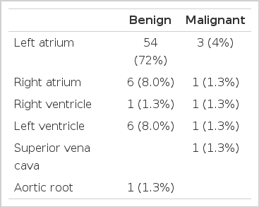 원발성 심장 종양이 발견된 위치는 좌심방이 54예(76%)로 가장 많았고, 우심방이 7예(9.3%)로 그 다음이었다. 종양의 위치는 양성 종양과 악성 종양을 나누어 표 3에 요약하였다. 2명의 점액종 환자에서 종양이 두 군데 이상 발견되었는데, 그 중 한 명은 좌심방 및 좌심실에서 종양이 발견되었고, 나머지 한 명에서는 좌심방과 aortic root에서 종양이 발견되었다. 대부분의 환자에서 하나 또는 두 종류의 증상을 호소하였는데, 가장 흔한 증상은 호흡곤란(48.1%)이었고, 그 다음으로는 흉통(26.6%)이었다(표 4). 진단은 대부분 처음에 심초음파를 통해 진단되었다(표 5). 악성 심장 종양이 의심되는 환자는 흉부 전산화단층촬영까지 한 경우가 많았다. 섬유종으로 진단된 여자 환자의 경우에는 컴퓨터단층촬영 및 자기공명영상 촬영 모두 시행하였고, 흉강경 검사를 통한 조직학적 소견으로 확진하였다. 전체 71명의 환자 중 수술을 통해 치료 및 조직학적으로 확진한 경우는 52명으로 수술률은 73.2%였다. 합병증으로는 혈류 폐쇄로 인한 합병증이 가장 많았는데, 특히 심부전의 합병증이 가장 많았다(표 6). 평균 추적관찰 기간은 26.8±21.3개월이었고, 수술 도중 사망한 1명(1.5%)을 제외한 대부분의 양성 원발성 심장 종양 환자는 생존하였다. 반면, 악성 원발성 심장 종양 환자의 6명 중 4명(67%)이 사망하였다. 한 명의 환자에서 처음에 점액종으로 진단되어 수술로 성공적으로 제거하였으나, 10개월 후 종양이 재발하여 재수술하였고, 조직검사상 myxoid spindle cell sarcoma로 확진된 경우도 있었다.