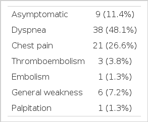 원발성 심장 종양의 임상양상의 특징은 종양의 위치와 크기에 영향을 많이 받는다1). 대부분의 환자에서 색전, 심장내 폐색 그리고 전신증상(constitutional symptom)의 세징 후(triad) 중에서 하나 이상의 증상을 호소하였다1,2,10,11). 종양의 크기가 작을 경우 증상이 없을 수도 있다1,12). 본 조사에서는 원발성 심장 종양이 있는 총 71명의 환자 중 59명(74.7%)이 호흡곤란 또는 흉통을 호소하였고, 혈전색전증의 증상을 호소한 환자는 단지 3명(3.8%)뿐이었다. 비특이적인 전신증상을 호소한 환자는 6명(7.2%)이었다. 연세대학교에서 강 등6)이 보고한 내용에 따르면 호흡 곤란을 호소한 환자는 69%, 색전 증상을 호소한 15%, 그리고 전신 증상을 호소한 환자는 50%나 되었다. 또한 가톨릭대학교에서 조사한 결과에는 호흡곤란 등의 폐색관련 증상(obstructive symptom)은 76%, 색전 증상은 20%, 전신 증상을 호소한 환자는 50%나 되었다7). 본 연구와 비교하였을 때, 색전 증상 및 전신 증상을 호소하는 환자 비율에 있어서 차이를 보였는데 정확한 이유는 알 수 없다. 추측컨대, 두 조사 모두 한 병원에서 비교적 오랜 기간 동안 원발성 심장 종양 환자를 모은 자료라서, 과거 심초음파가 보편적으로 시행되지 않았을 때에는 경미한 증상의 원발성 심장 종양 환자를 진단하기 매우 어려웠고, 색전증을 호소하는 환자들을 역으로 조사하여 원발성 심장 종양 환자를 발견했을 가능성이 높았을 것으로 추측된다. 본 연구처럼 심초음파가 널리 시행되고 있는 최근에 비교적 짧은 기간 동안, 특정한 한 지역사회에서 자료를 모았다면 결과가 달라졌을 수도 있다고 생각한다.
