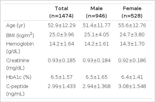 전체 환자 1,474명 중 남자는 946명(64.2%), 여자는 528명(35.8%)이었으며, 전체 환자의 평균 연령은 52.9±12.29세였고, 남자는 51.4세, 여자는 55.6세였다. BMI는 남자 25.1±4.05 kg/m2, 여자 24.7±3.80 kg/m2, 공복 시 C-peptide는 남자 2.94±1.368 ng/mL, 여자 3.08±1.548 ng/mL였으며 혈색소는 14.2±1.64 g/dL, 크레아티닌은 0.93±0.185 mg/dL였다(표 1).