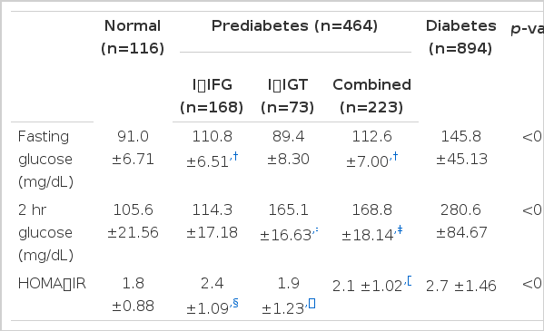 75 g 경구당부하검사를 시행한 결과상 정상은 116명이었으며, 전당뇨병 환자는 464명, 당뇨병 환자는 894명이었다. 전당뇨병 환자 464명 중 공복혈당장애만을 가진 환자는 168명, 내당장애만 가진 환자는 73명, 복합장애를 가진 환자는 223명이었다. 각각의 공복 시 혈당과 경구당부하검사 후 2시간 혈당은 정상군 91.0±6.71 mg/dL, 105.6±21.56 mg/dL, 공복혈당장애군 110.8±6.51 mg/dL, 114.3±17.18 mg/dL, 내당장애군 89.4±8.30 mg/dL, 165.1±16.63 mg/dL, 복합장애군 112.6±7.00 mg/dL, 168.8±18.14 mg/dL, 당뇨병군 145.8±45.13 mg/dL, 280.6±84.67 mg/dL였으며, HOMA-IR은 정상군 1.8±0.88, 공복혈당장애군 2.4±1.09, 내당장애군 1.9±1.23, 복합장애군 2.1±1.02, 당뇨병군 2.7±1.46이었다(표 2).