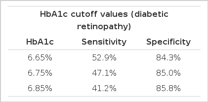 전체 환자 중 안과 진료를 통해 당뇨병성 망막병증 유무에 대해 진단 받은 616명의 환자를 조사하였고, 당화혈색소에 대한 ROC curve (AUC 0.814)를 분석하였다. 당뇨의 진단기준으로서 민감도가 85% 이상의 기준에 해당하는 당화혈색소는 6.75%였다(표 3).