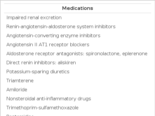 또한 RAAS 억제제들 외에도 많은 약물들이 고칼륨혈증 발생에 관여하는 것으로 알려져 있다(표 1). 비스테로이드성 항염증 약물(nonsteroidal anti-inflammatory drugs, NSAIDs), 베타 차단제, 헤파린 그리고 calcineurin 억제제들이 대표적이다[4]. NSAIDs는 프로스타글란딘 합성 억제제로서 작용하고 신혈류에 영향을 줄 수 있는데 저레닌성 저알도스테론혈증을 유발하여 고칼륨혈증과 대사성 산증을 발생시킨다[10]. 항생제 중에서는 trimethoprim-sulfamethoxazole이 대표적인데 trimethoprim이 ACEi 혹은 ARB 복용 환자들에게서 고칼륨혈증을 일으키는 기전은 원위 세뇨관에 있는 내강 쪽 나트륨 통로에 대해서 amiloride와 유사한 억제력을 발휘하기 때문으로 생각된다[11]. 이로 인하여 나트륨 재흡수와 칼륨 배설이 억제되어, 혈청 칼륨의 상승 가능성이 높은 환자들에게 임상적으로 유의한 고칼륨혈증을 일으키는 것이다.