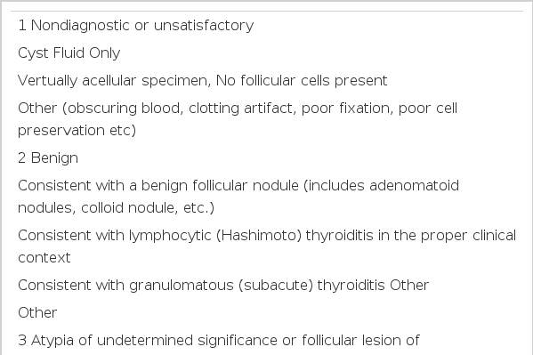전통적으로 FNAC의 결과는 비진단적, 악성, 미결정, 양성 세포소견과 같은 네 가지 범주로 분류되었으나, 2009년 “National Cancer Institute Thyroid Fine-Needle Aspiration State of the Science Conference”에서 발표한 Bethesda system [3]은 두 개의 범주를 추가하여 1) 비진단적, 2) 양성, 3) 비정형(atypia of undetermined significance or follicular lesion of undetermined significance), 4) 여포종양 혹은 여포종양 의심(Hűrthle 세포유형이면 구별하여 진단), 5) 악성 의심, 6) 악성으로 분류하였다(표 1).