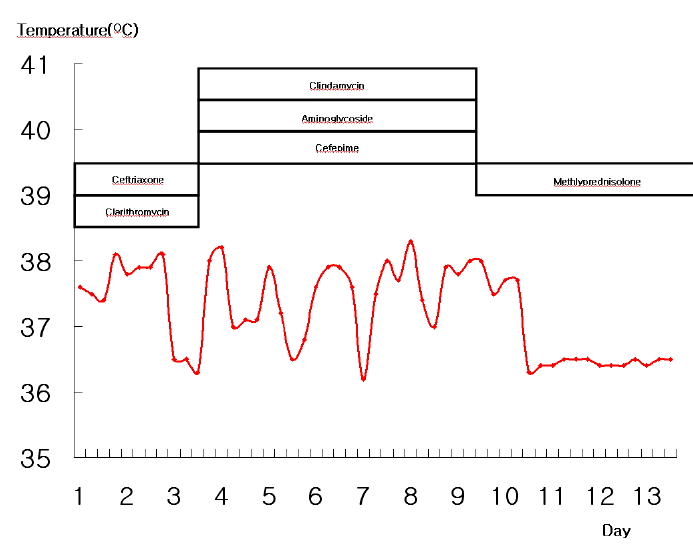 치료 및 경과: 환자는 입원하여 3일간 항생제 치료하였으나 발열 지속되어서 4일째부터 cefepime, aminoglycoside 및 clindamycin을 병합하여 사용하였고, 6일째 흉부 X-선에서 오른쪽 폐 병변은 다소 호전소견을 보였으나 양측 폐에 흉수가 새로 발생하였다(그림 2B). 혈액배양 검사, 객담배양검사, 객담 항산균 도말검사 등 모두 특이 소견이 없었다. 발열이 입원 9일째까지 지속되었으며 피부 조직 검사 결과 스위트 증후군으로 진단하고, 입원 9일째부터 methylprednisolone 62.5 mg을 하루 한 번 정맥 투여 하였으며 내원 10일째부터 발열은 사라졌다(그림 4). 이후 7일간 methylprednisolone을 투여한 후 경구 전환하였다. 피부 병변은 스테로이드 사용 전까지 호전이 없다가, 사용 이후부터 점차 발진이 호전되고 병변이 줄어들기 시작하면서 내원 17일경에는 거의 사라졌다. 폐의 병변도 스테로이드 사용 전까지는 큰 호전이 없다가, 사용 후부터 호전 양상을 보여, 입원 25일째 흉부 X-선 사진상 오른쪽 폐의 경화 소견은 남아있었으나 이전에 비하여 크게 호전된 양상이었고, 양쪽 폐에 발생한 흉수는 모두 사라졌다. 입원 26일째 퇴원하였고, 이후 저용량 경구 스테로이드를 유지하면서 경과관찰하였으며 퇴원 1달 뒤 시행한 흉부 X-선 사진은 호전되어 특이 소견을 보이지 않았다.