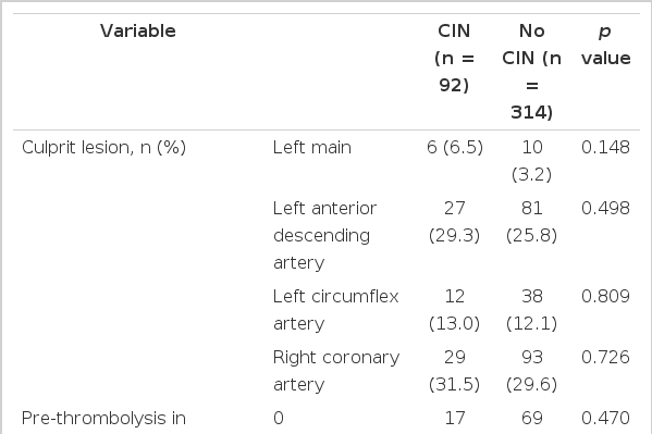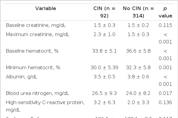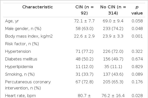 From January 2005 to June 2010, we evaluated the clinical, laboratory, and angiographic data of 406 patients with ACS who had a serum creatinine ≥ 1.3 mg/dL and underwent CAG or PCI. The patients were divided into two groups according to the development of CIN (CIN, n = 92; no CIN, n = 314).