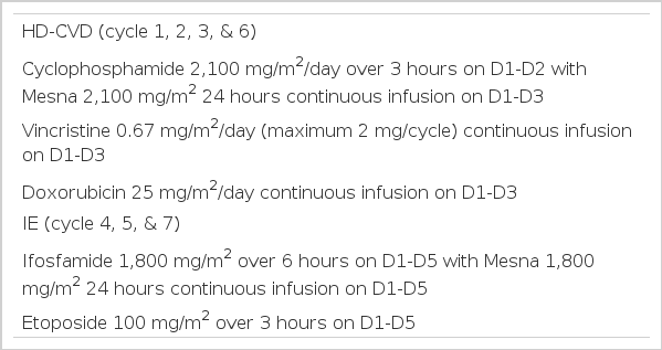 치료 및 경과: 환자는 조직 검사 후 결합조직형성 소원형세포종양으로 진단되었으며, 진단 당시 간, 림프절, 그리고 복강 내에 종양이 광범위하게 퍼져 있어 2010년 3월 5일부터 우선 고용량의 전신 항암화학 요법으로 치료를 시작하였다. 항암화학 요법은 P6 protocol [3] (Table 1)으로 3차례의 high-dose CAV (cyclophosphamide, vincristine, doxorubicin) 투여 후에 촬영한 복부전산화 단층촬영에서 RECIST (Response Evaluation Criteria In Solid Tumor) 1.0에 의거한 partial response를 보였다. 이후 2차례의 high-dose IE (ifosfamide, etoposide)을 추가로 실시 후 추가적인 반응을 얻어 용적축소수술을 계획하였다(Fig. 3A). 2010년 7월 12일 우측 결장 반절제술, 간우엽절제술, 우측 부신절제술을 실시하였고 간의 다발성 종괴와 골반강 내의 종괴는 일부만 제거하여 수술 후에도 간과 골반강 내에 일부 종괴는 남아 있는 R2 resection이 되었다(Fig. 3B). 조직검사결과 역시 결합조직형성 소원형세포종양으로 확인되었고, 이후 high-dose CAV 1 차례와 highdose IE 1 차례를 추가로 실시하여 2010년 9월 24일 P6 protocol을 완료하였다. 계획된 P6 protocol 완료 후 doxorubicin의 축적 용량은 300 mg/m2였다. 추가적인 반응을 얻기 위하여 전신 항암화학 요법을 지속하기로 결정하였고 2010년 9월부터 2010년 11월까지 IE를 3회 추가로 시행하였으며, 추가적인 종양반응을 얻어서 2차 수술을 계획하였으나, 당시 상태에서 남아 있던 골반강 내의 종괴(Fig. 3B)를 제거하기 위해서는 골반내장적출술(pelvic extenteration)이 시행되어야 하였고, 이 경우 장루(colostomy)와 요루(urostomy) 형성이 필요하였기 때문에 환자의 향후 삶의 질을 고려하여 골반강 내 종괴를 추가적으로 줄이기 위한 국소 방사선 치료를 시행하기로 계획하였다. 2010년 12월부터 2011년 2월까지 골반강 내종괴에 대해 5,400 cGy의 방사선 치료를 시행하였으며, 방사선치료 기간 동안 용량을 줄인 IE 항암화학 요법을 2회 동시에 시행하였다. 방사선 치료 후 지연반응(delayed response)을 기대하기 위해 추가적인 전신 항암화학 요법을 시행하면서 경과관찰하기로 하였고, 2011년 3월부터 2011년 5월까지 추가적으로 high-dose CAV 요법을 2회 실시하였다(doxorubicin 축적 용량 429 mg/m2). 이후 1차 수술 후 남아 있었던 간내 종괴와 골반강 내의 종괴(Fig. 4A)는 2011년 5월 확인한 복부전산화 단층촬영(Fig. 4B)에서 모두 추가적인 반응을 보여 2011년 6월 20일 2차 수술을 시행하였으며, 2차 수술은 완치 목적의 종괴 절제를 시도하였다. 수술은 골반강 내 직장 방광부위에 종양(1.5 cm), 복강내 좌측 잘룩창자 옆 종양(8 mm), 그리고 간내 종양(3 cm)에 대해 제거수술을 실시하였다. 직장 방광부위 및 좌측잘룩창자 옆 종양 제거 경계에서 현미경적으로 악성세포가 확인되어 R1 resection이 되었다. 두 번째 수술 당시 제거 경계에 암이 남아 있던 골반강 내의 직장 방광부위에 국소적인 재발이 의심되는 소견이 있지만 아직 확실치 않으며 그 외 다른 병변의 증거는 없는 상태이다(Fig. 4C). 환자는 항암치료와 방사선 치료, 그리고 두 차례의 수술 등의 적극적인 치료로 만 23개월째 무질병 상태로 유지 중이며, 골반강 내 국소 재발 의심 병변에 대해서는 경과관찰하면서 재발의 증거가 확실해지는 시점에서 3차 수술적 치료를 고려하고 있다.