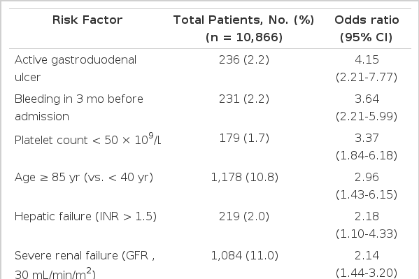 프랑스에서 153명의 광범위 폐색전증과 우심실 기능부전이 있는 환자를 대상으로 혈전용해 치료를 시행한 결과 혈전용해 치료 군이 항응고제만 사용한 군에 비해 치료 1주일째 폐관류스캔에서는 유의하게 호전되었으나, 이와는 달리 예후는 좋지 않았다[4]. 혈전용해제를 사용한 군은 사망률이 6%였고, 항응고제만 사용한 군에서는 사망 환자가 없었다. 뇌출혈의 빈도는 4.7%나 되었다. ICOPER (International Cooperative Pulmonary Embolism Registry) 연구에서도 혈전용해제 사용 후 3%의 뇌출혈을 보고한 바 있어서 혈전용해제 치료에 따른 출혈의 위험에 대한 심각한 우려가 있다[5]. ICOPER 연구는 임상시험이 아닌 임상에서 보는 환자를 등록한 것이므로, 실제 임상에서 일어나는 일들을 대변한다고 볼 수 있다. 급성심근경색증에서 혈전용해제를 사용한 경우에는 뇌출혈의 발생률이 0.95%로 위험인자로는 나이와 고혈압이었다[6]. 따라서 폐색전증에 쇼크나 저혈압이 동반한 경우에도, 출혈의 위험성을 평가해서 혈전용해제를 사용하는 것이 필요하다. 출혈의 위험성을 평가할 때 다음의 연구를 참조할 수 있다. 관찰연구에서 10,866의 입원 환자 중에 병원 내 출혈(중대한 또는 중대하지 않은 출혈을 포함)의 위험인자들은 다음과 같다. 고 위험 요인은 활동성 위십이지장궤양, 입원 전 3개월 이내의 출혈, 50 × 109/L 미만의 혈소판, 85세 이상의 나이, 간 장애, 심한 신장 장애, 그리고 중환자실 또는 병동단위의 집중치료가 뒤를 따른다(Table 1) [7]. 이 위험점수가 복잡하고 아직 검증되지 않았지만, 출혈 위험인자를 여러 개 가지고 있거나 출혈의 관련성이 높은(odds ratio > 3.0) 세 가지 위험인자 중의 하나를 가지고 있을 경우 출혈의 고위험군으로 분류할 수 있다.