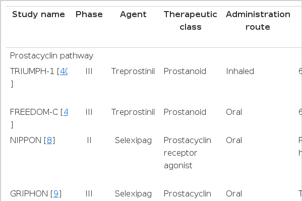 2012년 11월 현재까지 순차적 병용 요법에 대한 9개의 임상 연구가 완료되었으며, 대부분은 일차 약제로 PDE-5 inhibitor나 ERA를 사용하고 있는 환자들이 임상적인 악화를 나타낼 때 프로스타노이드(prostanoids)를 추가하는 것을 평가하였다(Table 3).