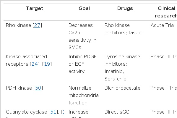 2006년 일본에서 8명의 폐동맥 고혈압 환자를 대상으로 rho-kinase inhibitor인 파수딜에 대한 안정성에 대한 소규모의 임상연구[27]가 진행되었으며, 정맥용 파수딜(intravenous fasudil)의 사용은 긍정적인 급성 반응을 나타내었고, 흡입용 파수딜(inhaled fasudil)로 진행된 임상 시험에서도 폐혈관 저항(pulmonary vascular resistnace)의 호전을 가져오는 것으로 나타났다[28]. 이러한 Rho signaling activation은 hydroxy3-methyl-glutaryl coenzyme A inhibitors, 즉 스타틴(statins)에 의해서도 억제되는 것으로 알려져 있다.