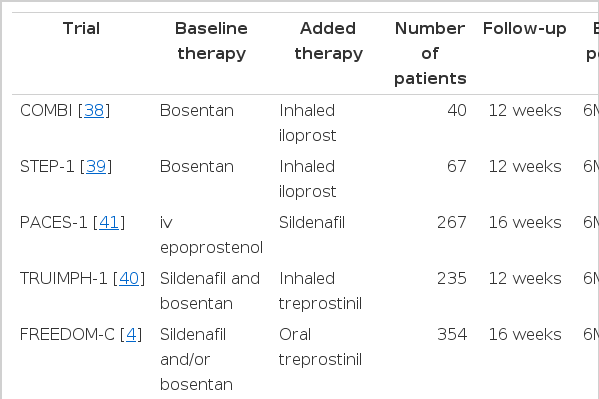 COMBI trial [38]은 보센탄 투여군에 흡입용 일로프로스트를 추가하는 것을 평가하였으나 병용 요법은 이득을 나타내지 않았고, 실데나필과/혹은 보센탄의 기본 치료를 받고 있는 환자들에게 경구용 트레프로스티닐 제재를 추가한 FREEDOM-C에서도 운동능력의 향상은 나타나지 않았다[4].