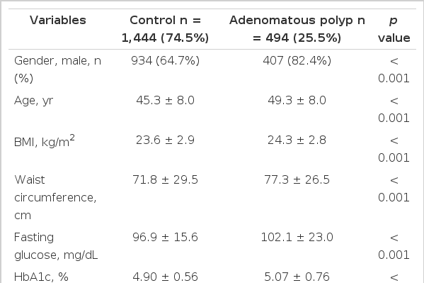 총 연구 대상자는 1,938명이며 494명(25.5%)에서 선종성 폴립이 발견되었으며 비알코올성 지방간질환은 507명(26.2%)에서 발견되었다. 대조군과 비교하여 선종성 폴립군에서 남자, 고연령의 경향이 있었으며 BMI, 공복 혈당, 허리둘레, 당화 혈색소, 수축기, 이완기 혈압, 전체 콜레스테롤, 중성지방, 헤모글로빈, 요산, γGT의 항목에서 통계적으로 유의하게 높게 관찰되었다. 대사증후군, 당뇨병, 고혈압, 비알코올성 지방간질환 또한 통계적으로 유의하게 높은 유병률을 보였다(Table 1).