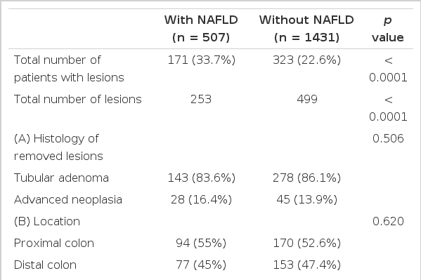 We reviewed 1,938 consecutive individuals who underwent screening colonoscopy at Changwon Fatima Hospitalbetween Jan 2009 and Sept 2011. The individuals were divided into adenomatous polyp (Group A; n = 494) and control (Group B;n = 1,444) groups. NAFLD was diagnosed by increased echogenicity on abdominal ultrasound.