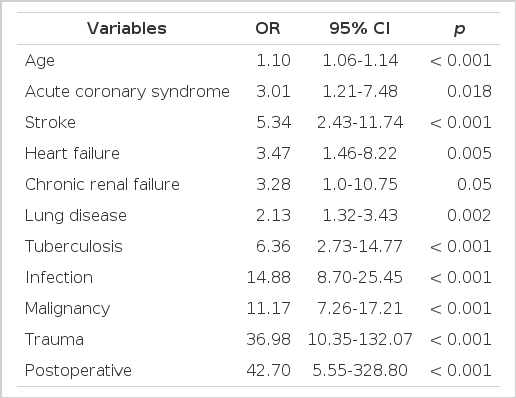 D-dimer 검사에서 양성 결과를 보이는 질환들에 대한 로지스틱 회귀분석의 결과, 연령의 증가, 외상, 수술의 기왕력, 급성 감염, 결핵, 뇌혈관 질환, 악성종양, 만성 신부전, 급성 관동맥 증후군, 심부전, 호흡기 질환 등이 D-dimer 위양성을 유발하는 인자로 확인되었다(Table 2). 이 중 가장 관련성이 높은 질환은 수술의 기왕력이었고(OR = 42.70 [95% CI = 5.55 to 328.80], p< 0.001), 폐결핵, 기관지 결핵, 결핵성 흉막염 등, 결핵에 의한 감염도 유의한 유발인자로 관찰되었다(OR = 6.36 [95% CI = 2.73 to 14.77], p< 0.001). 그리고 안정형 협심증과 변이형 협심증을 포함한 심혈관 질환의 경우 D-dimer 검사의 위양성 결과와 관련성이 없었으나, 급성 관동맥 증후군만을 분석하였을 때는 D-dimer 검사의 위양성을 유발하는 인자로 확인되었다(OR = 3.01 [95% CI = 1.21 to 7.48], p= 0.018). 그리고 연령을 65세 기준으로 나누었을 때 65세 이상의 환자들이 65세 미만의 환자들에 비해 위양성을 나타낼 가능성이 높았다(OR = 1.93 [95% CI = 0.66 to 12.38], p= 0.008).