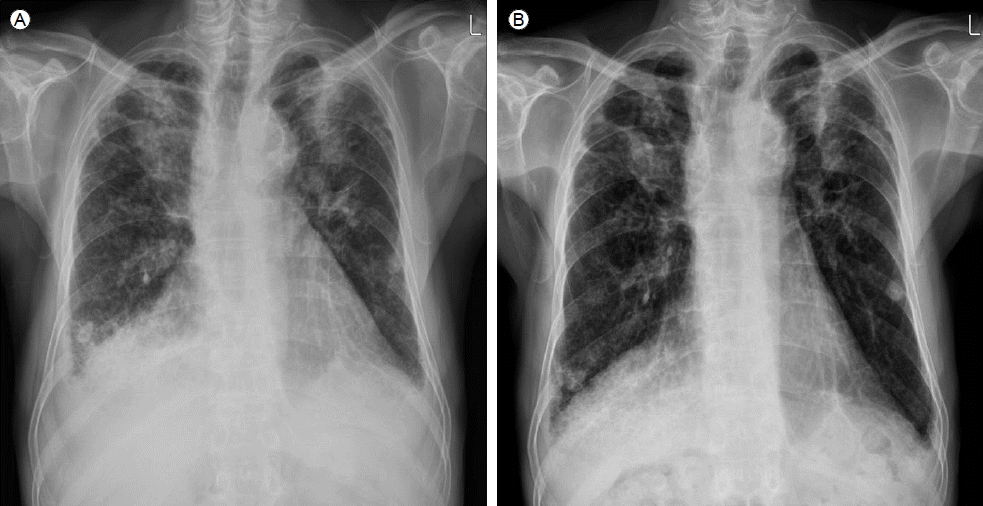 The chest X-ray before treatment shows (A) diffuse, irregular infiltrations in the lung parenchyma bilaterally, and tumor-like lesions in both upper lobes. These findings were seen in previous chest films and had not changed. The pleura effusions at the costophrenic angles were new and the left cardiac border was bulging slightly. (B) After 4 weeks of steroid therapy, the costophrenic angle blunting had improved bilaterally and the cardiac border was slender.