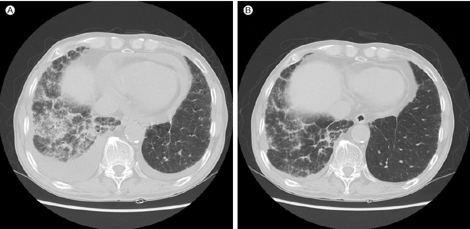 류마티스성 흉막염과 심장막염이 발생하여 환자의 호흡곤란이 악화된 것으로 판단하고 프레드니솔론 0.5 mg/kg을 하루 한번 투여하기 시작하였다. 치료 시작 일주일 후 환자는 호흡곤란이 호전되었고, 프레드니솔론을 유지하면서 퇴원하였다. 4주 후 시행한 흉부방사선 사진에서는 치료 전과 비교하여 흉수가 감소한 소견을 보였고(Fig. 1B), 2개월 후 추적검사한 흉부 방사선단층촬영에서도 양측의 흉수가 거의 소실되고, 심장막액도 감소한 모습이 관찰되었다. 더불어 우하엽의 병변도 치료 전보다 호전되었다(Fig. 2B). 환자는 이후 6개월 동안 증상악화 없이 스테로이드 감량하며 경과관찰 중이다.