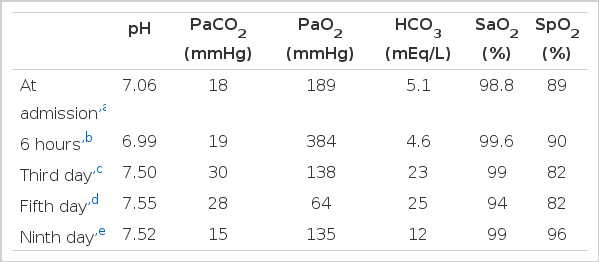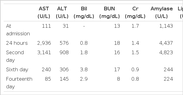 말초 혈액검사상 백혈구 31,000/mm3, 혈색소 13.2 g/dL, 혈소판 137,000/mm3였고, 생화학 검사상 Na 146 mEq/L, K 3.4 mEq/L, Cl 109 mEq/L, BUN 13 mg/dL, Creatinine 1.7 mg/dL, AST 111 IU/L, ALT 31 IU/L였다. 기관삽관과 분당 15 L의 산소를 공급한 후 측정한 동맥혈 가스검사상 pH 7.06, PaCO2 18 mmHg, PaO2 189 mmHg, HCO3- 5.1 mEq/L, SaO2 98.8%였으며, 이후 시행한 시간경과에 따른 혈액검사 소견은 표 1, 표 2, 그림 1과 같다.