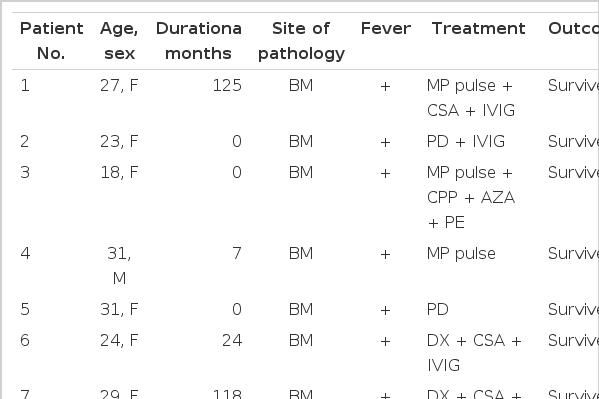 최근 면역억제치료에 반응이 나쁜 환자에서 infliximab [8], etanercept [9], alemutuzmab [10]을 사용하여 성공적으로 치료한 예가 있다.