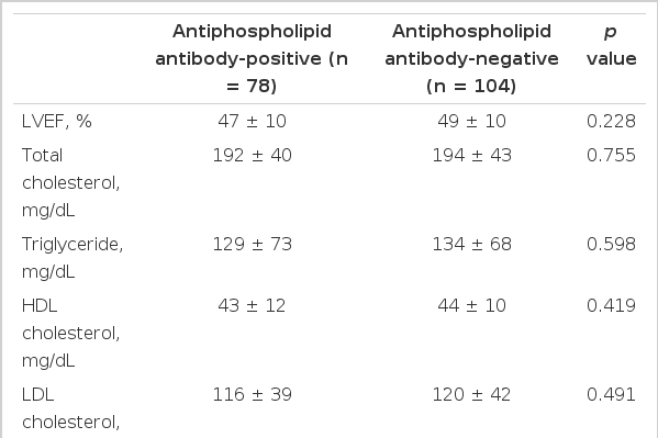 약물방출 스텐트를 성공적으로 삽입한 급성 심근경색증 생존자 182명 중 루푸스 항응고인자를 검사한 사람이 181명이었으며, 항카디오리핀 항체 IgM, IgG를 검사한 사람은 180명이었다. 이들 중 78명이(42.6%) 루푸스 항응고인자 또는 항카디오리핀 항체에 양성이었다. 루푸스 항응고인자 양성은 181명 중 68명(37.4%)이었으며, 항카디오리핀 항체 IgM 양성은 180명 중 15명(8.2%), 항카디오리핀 항체 IgG는 180명 중 3명(1.7%)이 양성이었다. 전체 환자의 평균나이는 63 ± 14세, 남자가 134명(73.6%)이었고, ST분절 상승 심근경색증은 123명(67.6%), ST분절 비상승 심근경색증은 59명(32.4%) 이었다. 모집단에서 급성 심근경색증이나 뇌졸중의 과거력이 있는 환자는 15명(8.2%)이었다. 항인지질항체 양성군의 나이는 66 ± 14세, 음성군에서는 61 ± 14세로 양성군이 더 고령이었다(p= 0.009). 남자가 양성군에서 61명(78.2%), 음성군에서 73명(70.2%)으로 통계적으로 차이가 없었다(p= 0.225). 그리고 급성 심근경색증에서 ST분절 상승 유무, 이전 뇌졸중 과거력을 제외한 동반질환, 흡연, 급성 심근경색증 후 추적관찰 기간 및 내원 당시 활력징후에서 의미 있는 차이가 없었다(Table 1). 심초음파상 좌심실 구축률, 혈액학적 검사상 콜레스테롤 수치 및 당화혈색소, creatinine, 혈색소에서도 통계적으로 의미 있는 차이가 없었다(Table 2). 또한 ST 분절 상승 심근경색증의 경우 통증 후 관상동맥 중재술까지 걸린 시간에서 의미 있는 차이가 없었다(Table 3). 그러나 항인지질항체 양성군에서 뇌졸중의 과거력 빈도가 통계적으로 의미있게 높았으며(p= 0.046), killip class가 더 높았다(p= 0.048) (Tables 1 and 2).