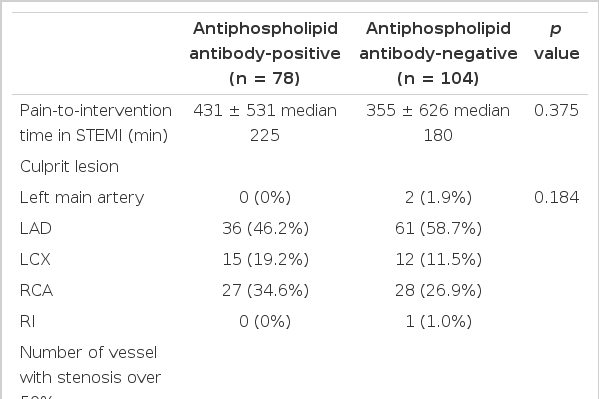 ST분절 상승 심근경색증의 경우 통증이 발생한 후 평균 6.3시간(6.3 ± 9.8시간, 중앙값 3.2시간)만에 관상동맥 조영술 및 중재술을 시행하였으며, ST분절 비상승 심근경색증은 조기 침습적 치료 전략으로 대부분 48시간 이내, 평균 20.8시간(21 ± 20.1시간, 중앙값 12.6시간)에 시행하였다. 관상동맥 조영술에서 경색관련 병변 위치에 대한 차이, 시술 당시 no reflow 현상, 혈전 흡입술, 대동맥 내 풍선펌프, 혈소판 당단백 IIb/IIIa 억제제의 사용에서 차이가 없었고, 관상동맥 내 시술 전 후의 TIMI 혈류에서 통계학적으로 의미 있는 차이가 없었다. 그러나 50% 이상 협착을 보이는 다혈관질환의 빈도가 항인지질항체 양성군에서 의미 있게 더 잦았으며(p= 0.006), 스텐트의 사용 개수가 양성군에서 더 많았으나 통계적으로 유의하지는 않았다(p= 0.080) (Table 3).