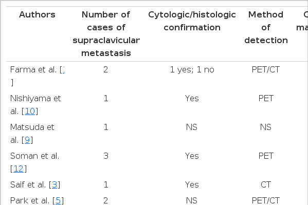 쇄골상부 림프절 전이는 주로 유방암, 폐암, 위식도암 그리고 림프종에서 흔하며, 췌장암에서의 쇄골상부 림프절 전이는 매우 드문 것으로 알려져 있다. 국내외 문헌을 포함하여 보고된 췌장암에서 쇄골상부 림프절 전이는 총 10명이며, 이 중 국내의 보고 예는 2명에 불과하다(Table 1).