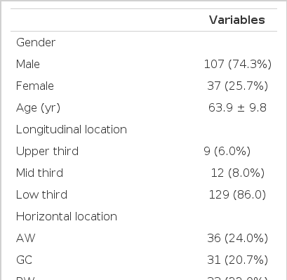 임상적 특성 및 조직병리학적 특성은 표 1에 나타내었다. 150예의 임상적 특성으로 남자는 107명(74.3%)이었고 평균 나이는 63.9 ± 9.8였다. 병변의 세로축 위치는 하부가 129예(86.0%)로 가장 많았으며 가로축 위치는 소만부가 50예(33.3%)로 상대적으로 가장 많았다. 병변의 육안적 형태는 함몰형 병변이 97예(64.7%)로 가장 많았으며 침윤 정도는 M cancer가 135예(90.0%)로 대부분을 차지하고 있었다. 분화도가 좋지 않은 경우는 8예(5.3%)였으며 2예는 확대 적응증에 포함되지 않았다[궤양동반(n = 1), 크기가 30 mm이면서 500 μm의 SM 침윤(n = 1)]. 일괄 절제는 139예(92.7%)에서 시행되었으며 완전 절제는 131예(87.3%)에서 시행되었다.
