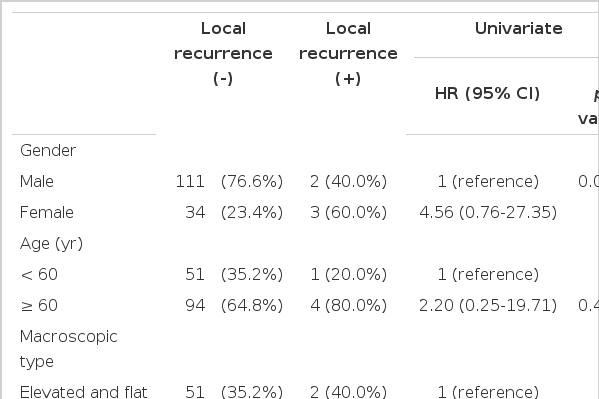 단변량 분석에서 성별과 60세 이상의 고령 유무 및 병변의 육안적 형태와 위치는 국소 재발의 위험인자가 아니었다. 또한 수직 절제면 양성 또는 판정 불가능한 경우, 분화도가 좋지 않은 암과 그렇지 않은 경우, 점막하 침윤 유무도 국소 재발의 위험인자는 아니었다. 하지만 절제된 조직의 크기가 20 mm 이상인 경우, 수평 절제면 양성인 경우, 분할 절제인 경우, 맥관 침습이 있는 경우는 국소 재발의 위험인자로 확인이 되었다.