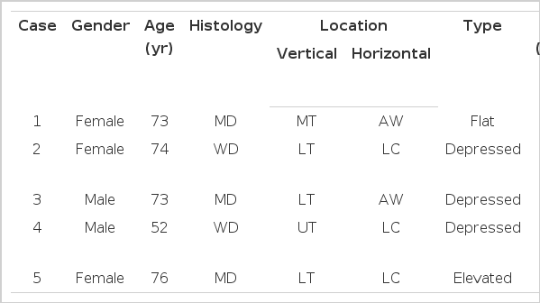 파리 분류에 따라 병변의 육안적 분류를 시행하였다. 융기형(elevated type; 0-I, 0-IIa, 0-I+IIa, 0-IIa+IIb, 0-IIa+IIc), 평탄형(flat type; 0-IIb), 함몰형(depressed type; 0-IIc, 0-III, 0-IIc+IIa, 0-III+IIa)으로 분류하였으며 육안적으로 혼합 형태인 경우 병변을 주로 이루는 형태로 대표하였다[13]. 일본 위암 학회에서 제시한 기준에 따라 해부학적인 병변의 위치와 병리학적 진단을 하였으며 조기위암은 점막 내에 국한된 경우 점막암(mucosal cancer, M cancer), 점막하 침윤이 있는 경우 점막하암(submucosal cancer, SM cancer)으로 구분하였다. 그리고 SM cancer는 SM1 (점막하 침윤 < 500 um)과 SM2 (점막하 침윤 ≥ 500 um)로 구분하였다[11,13,14].