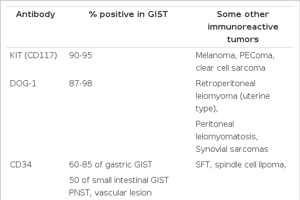 Recommended immunohistochemical markers for gastrointestinal stromal tumors (GIST) and some other immunoreactive tumors