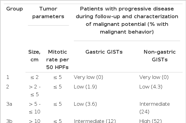 원격 전이가 없는 절제 가능한 국소 위장관기질종양에서는 종양의 크기, 세포분열의 수, 원발 장기 및 종양 파열의 유무가 수술 후 재발의 중요한 예후인자로 알려져 있다[11,19,20]. 절제 가능한 위장관기질종양에서는 2002년 미국보건원 기준에 의하면 종양 크기와 세포 분열의 수만으로 재발 위험도를 분류하였으나[21] 최근 Joensuu 등은 수술 전 또는 도중 종양 파열이 재발위험도에 영향을 미치며[20] Miettinen 등은 원발 장기 역시 위장관기질종양의 수술 후 재발 위험도를 결정하는 중요한 요인임을 제시하였다[22]. 현재 절제 가능한 국소 위장관기질종양에서는 2002년 미국보건원 기준보다는 원발 장기 또는 종양파열 유무를 추가한 새로운 재발 위험군 분류법을 많이 사용하고 있다[22,23]. 대한위장관기질종양연구회에서도 약간의 수정을 거쳐 종양크기, 세포 분열수와 원발 장기의 세 가지 변수를 포함하는 예후 예측표의 사용을 제시한 바 있다(Table 2) [22,24].