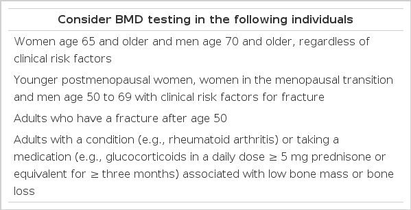 골다공증 치료에 대한 지침은 다양하지만 미국골다공증재단의 지침이 가장 일반적이고 널리 사용되고 있다[5]. 골다공증 치료는 당연히 골절의 위험이 높은 대상에 대해 시행되어야 한다. 폐경 후 여성이나 50세 이후 남성에서 대퇴골 골절이나 요추 골절이 있는 경우 또는 골밀도가 T 점수가 -2.5 이하인 경우에는 치료가 시작되어야 한다. 골다공증의 진단은 골밀도에 기반을 두고 있으나 골밀도만으로는 골절 위험을 평가하는 데 제한점이 있으므로 진단과는 별개의 개념으로 골다공증의 치료 대상을 선정해야 한다[6]. 미국골다공증재단에서는 위의 두 가지 경우 외에 골절위험도평가(Fracture risk assessment tool, FRAX)를 통해 척추 등 주요 부위 또는 대퇴골의 10년 골절 위험도가 각각 20% 또는 3% 이상인 경우 치료가 시행될 것을 권고하고 있다. 하지만 우리나라의 기준은 아직까지 마련되어 있지 않으므로 이 기준을 우리 진료 현장에 그대로 적용하기는 어렵다. 골다공증 치료를 고려하는 모든 환자는 위험인자를 줄이기 위한 상담이 필요하며 치료 프로그램의 일부로서 칼슘과 비타민 D 그리고 운동의 중요성에 대해 전문적인 상담을 받아야 한다. 치료를 시작하기에 앞서 2차성 골다공증의 가능성에 대한 평가가 이루어져야 하며 중심 골밀도 검사를 시행해야 한다. 골다공증 위험이 높아 골밀도 검사가 고려될 수 있는 경우를 표 1에 기술하였다.