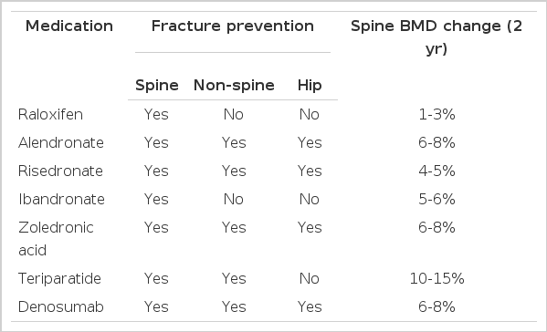 표 2에서 현재 사용 중인 골다공증 치료제의 골절 감소 효과에 대하여 요약하였다.