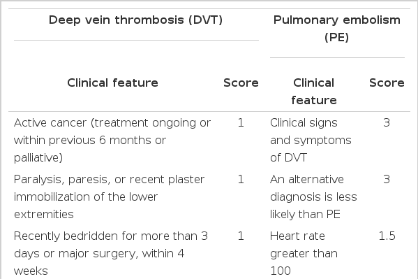 정맥혈전의 진단은 크게 임상가능성 평가와 영상검사로 병행된다. 임상가능성 평가표(Table 1)에 따라 DVT는 2점, PE는 4점 이상이 나오면 바로 정맥초음파 혹은 흉부 전산환단층촬영(폐동맥혈관조영법)을 통해 혈전 여부를 확인한다. 초음파로 DVT가 확진된 경우 무증상 PE의 확인을 위해 흉부 전산화단층촬영을 추가할 수 있다(Fig. 1).